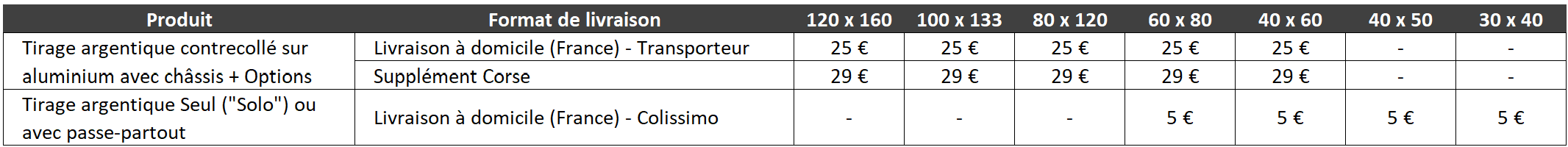 • Certains formats sont des dimensions importantes. Il est de la responsabilité du client de s’assurer que les conditions d’accès au lieu de livraison soient normales et adaptées (cf. CGV).